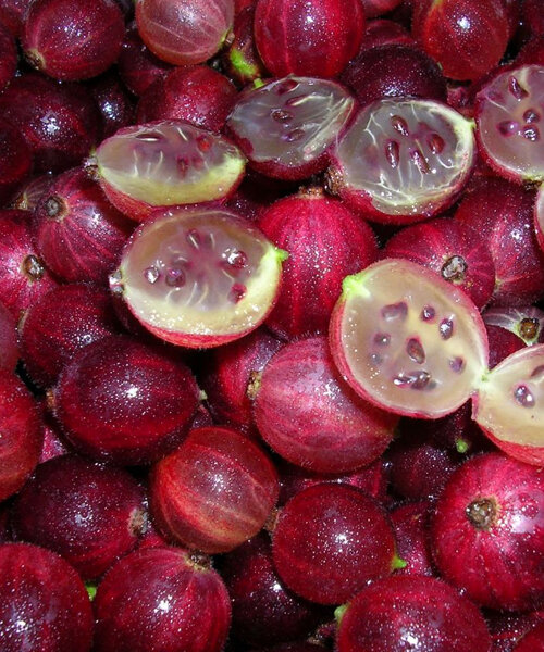 Ягоды: Крупные (до 6–8 г), округлой формы, при созревании приобретают темно-красный или бордовый цвет, кожица тонкая.